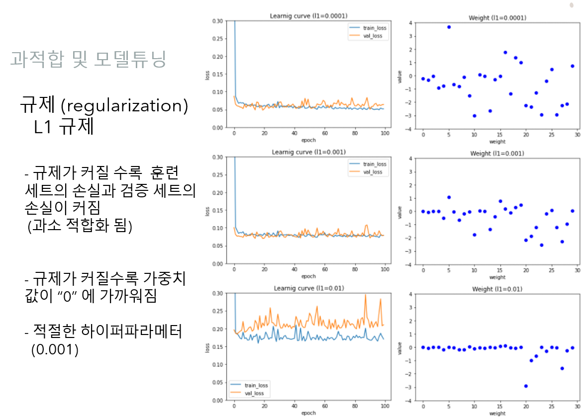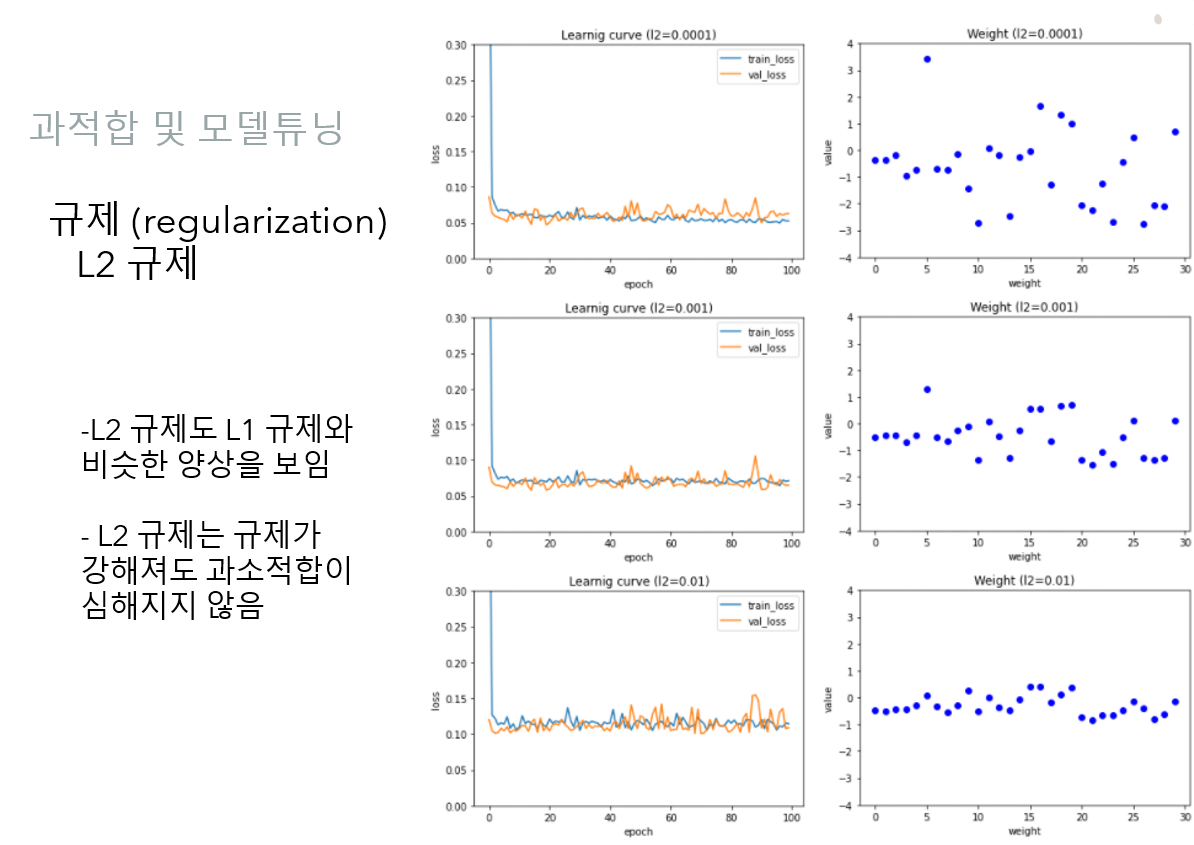규제의 효과를 보면 둘 다 가중치의 성장을 제한하는 모습. 정확히는 감소하는 방향으로 진행하는 모습을 볼수 있습니다. 가중치의 성장을 제한한다는것은 기존 학습에 영향을 끼칠 수 있는 데이터를 지양하겠다는 의미로 볼수 있습니다. 즉, 일반적인 패턴이 아닌 몇몇 독특하면서 희소한 패턴을 가지는 데이터에 대한 영향을 덜 받겠다는 뜻입니다.