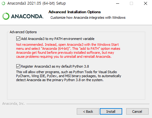 아나콘다를 환경변수에 설정하는 옵션으로 체크가 되어 있어야 어디에서든 아나콘다 명령어를 사용할 수 있습니다.